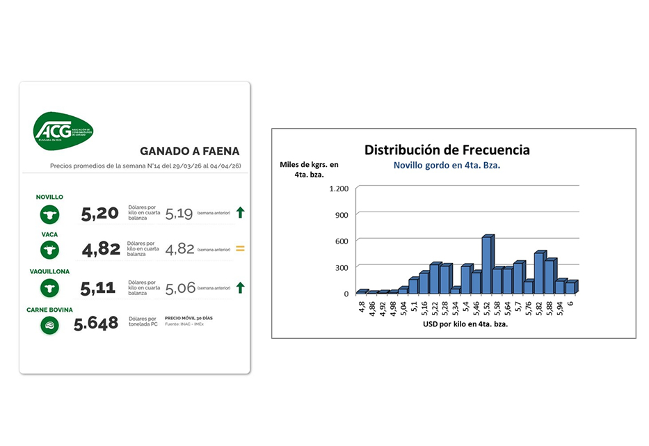 En la planilla de ACG subió un centavo la referencia para el novillo a US$ 5,20 por kilo y de cinco centavos para la vaquillona a US$ 5,11 por kilo. No hubo cambios para la vaca en US$ 4,82 por kilo.