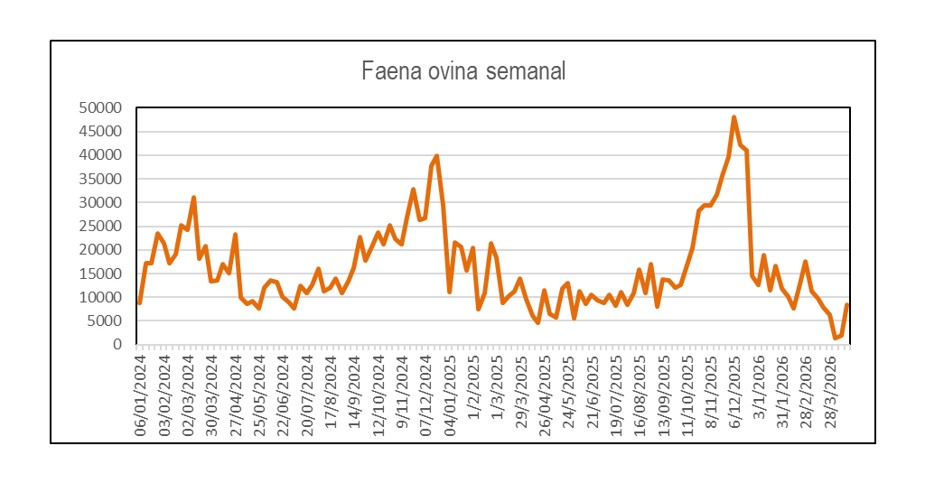 En el acumulado de 2026 hasta el 18 de abril la faena ovina fue de 158.813 cabezas, una caída de 22,7% frente a igual período del año anterior.
