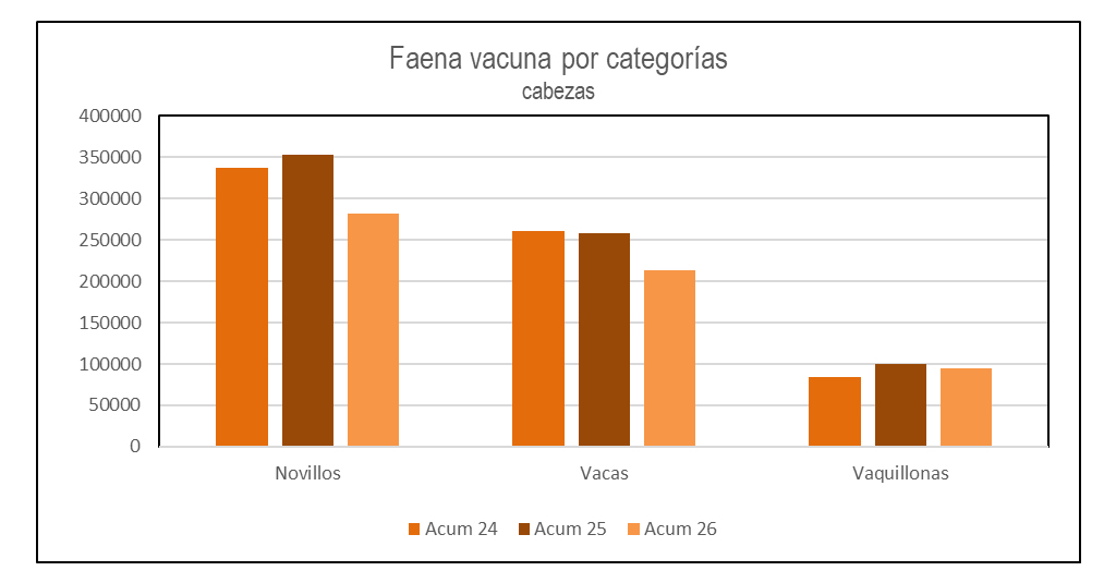 En los novillos se registra un descenso interanual de 20,3% con una baja de 17,3% en las vacas y de 5,4% en las vaquillonas.