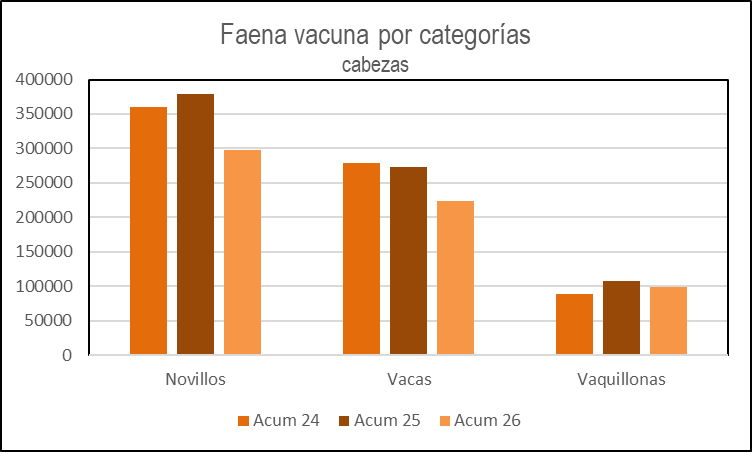 En los novillos se da un retroceso interanual de 21,5% con una baja de 17,9% en las vacas y de 7,2% en las vaquillonas.